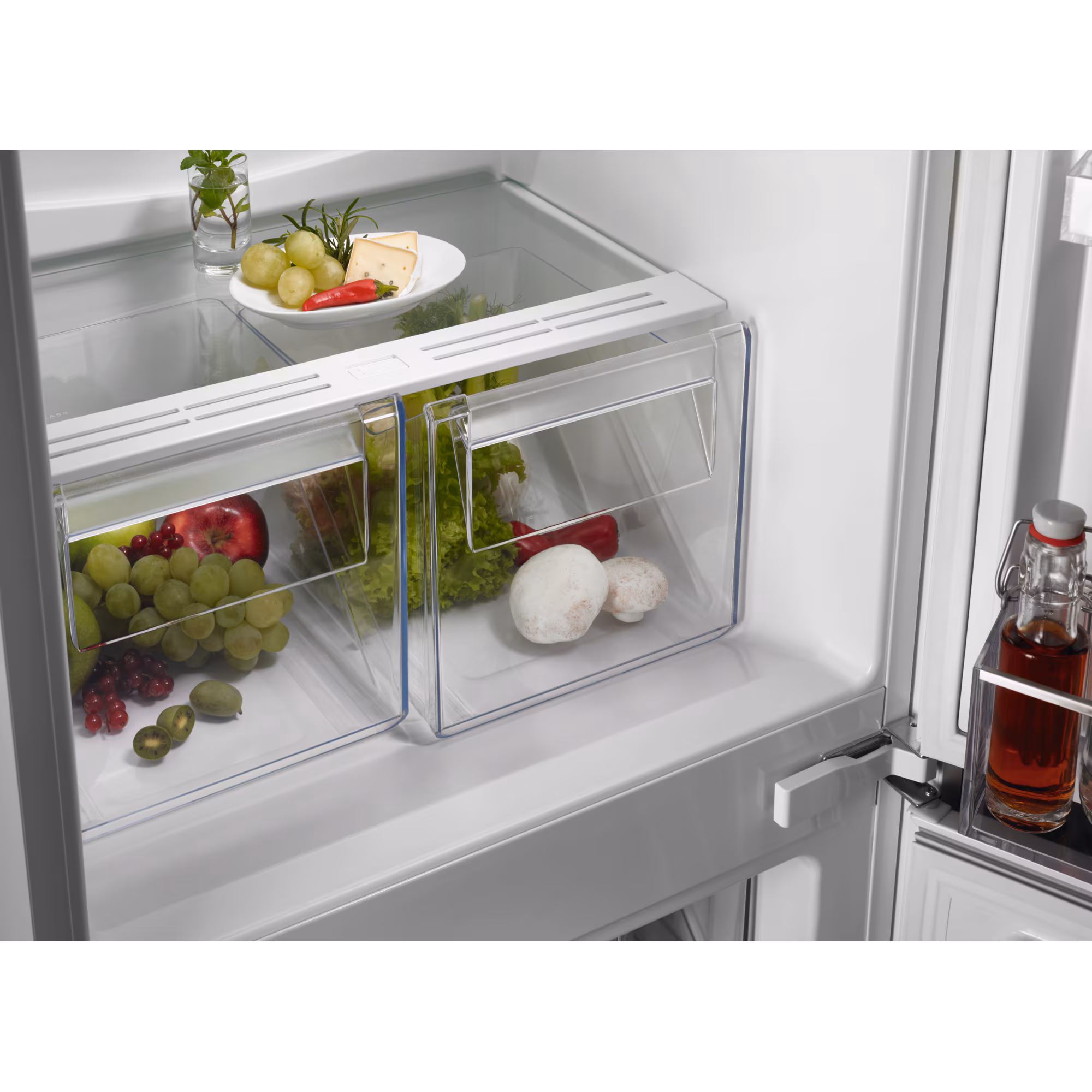The AEG OSC5S181ES Fridge Freezer from the 5000 Series combines generous storage, intelligent cooling and seamless built-in design in a refined custom-finish appliance. With a total capacity of 271 litres, including a 198-litre fridge and 73-litre freezer, it offers ample room for fresh and frozen essentials while fitting neatly into your kitchen cabinetry. Designed for convenience and quiet performance, it operates at just 34dB(A), making it ideal for open-plan living.