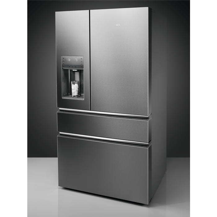 This massive fridge freezer from AEG is a large-capacity stainless steel French door fridge freezer, designed for ultimate convenience and style. Enjoy chilled water anytime with the Through-the-Door Water Dispenser. No Frost and MultiAirflow cooling keep your food fresher for longer, while Soft-rise LED lighting elegantly illuminates every corner.