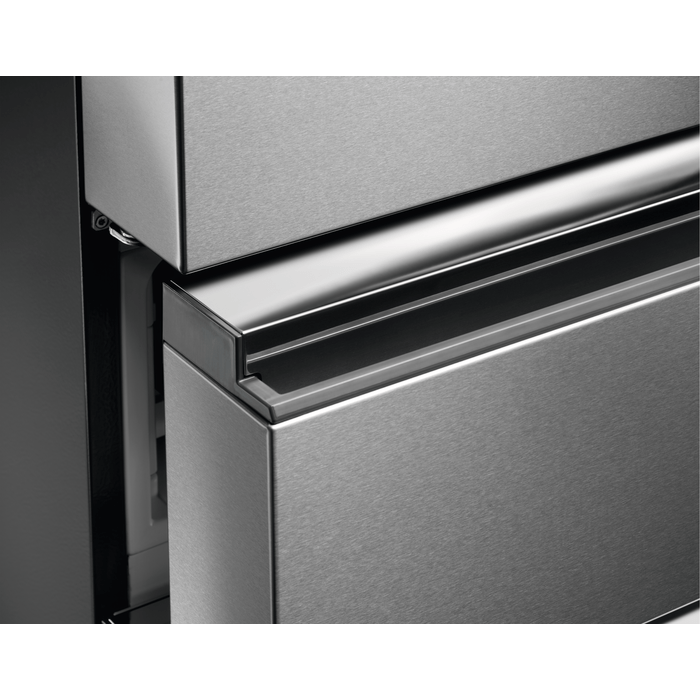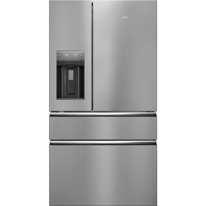 Discover the AEG RMB954E9VX 179cm Freestanding Fridge Freezer 179cm in Stainless Steel on KDH Electrical. Stainless Steel Finish AEG French Door Fridge Freezer – 617L Capacity, French Door Top Fridge, 2 Drawer Bottom Freezer, Energy Rating E with a Noise Rating of Just 40dB(A). MultiSwitch Fridge – A convertible compartment where you can independently set the temperature from -18 °C to 7 °C. TwinTech – Preserves food taste & texture. NoFrost – No need to defrost again. GreenZone+ – The sealing lid and humidity membrane of the drawer work together to maintain ideal moisture levels, ensuring that the nutrients, taste, texture, colour, and weight of fresh produce are preserved at their best.