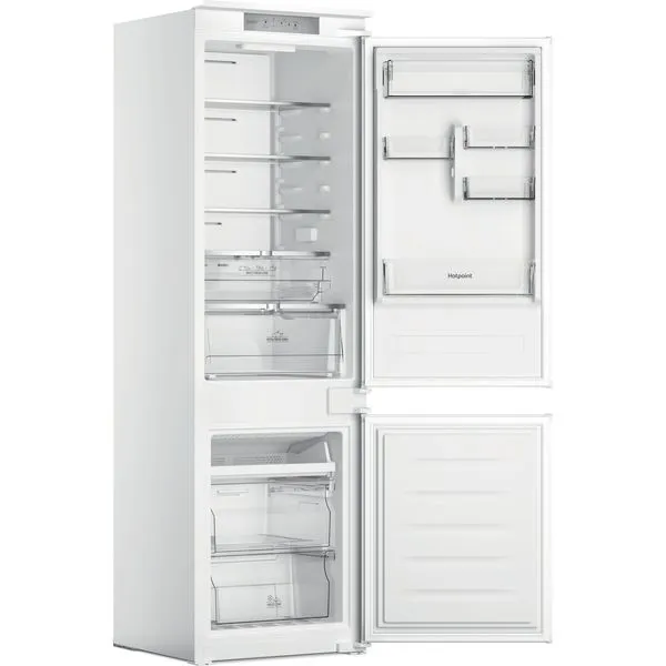 Discover the Hotpoint HTC18 T322 UK Built In Fridge Freezer in White on KDH Electrical. White Finish Hotpoint Fridge Freezer – 250L Capacity, Frost Free, 5 Fridge Shelves, 2 Fridge Drawers, 3 Freezer Drawers, Energy Rating E with a Noise Rating of Just 34dB(A). Fast Freeze – Rapidly lowers the freezer’s temperature to quickly freeze fresh food, preserving its texture and nutrients. No Frost – Prevents ice build-up, ensuring optimal cooling and easier maintenance without manual defrosting. Hotpoint Fresh Zone – Dedicated fridge compartment designed to maintain optimal humidity and temperature for preserving fresh produce longer. FreshZone+ – With Active Oxygen technology, it reduces bacteria and odours to keep food fresh for up to seven days.