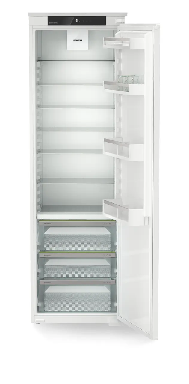 Discover the Liebherr IRBSd5120 Built In Plus BioFresh Larder Fridge in Custom Finish at KDH Electrical. Custom Finish Liebherr Larder Fridge – Plus Series, 294L Capacity, 98.2L BioFresh, 2 Temperature Zones, Sliding Hinge, Reversible Door, Touch Control Operation, Energy Rating D with a Noise Rating of Just 33dB(A). BioFresh – Keeps fruits & veggies fresh longer with 0°C temp & optimal humidity—no adjustments needed. Retrofittable SmartDeviceBox – Upgrade your Liebherr with the SmartDeviceBox for easy smart home connectivity, remote control, and seamless digital management. PowerCooling system – A powerful, quiet fan ensures cold air is evenly distributed throughout the entire fridge for optimal cooling.