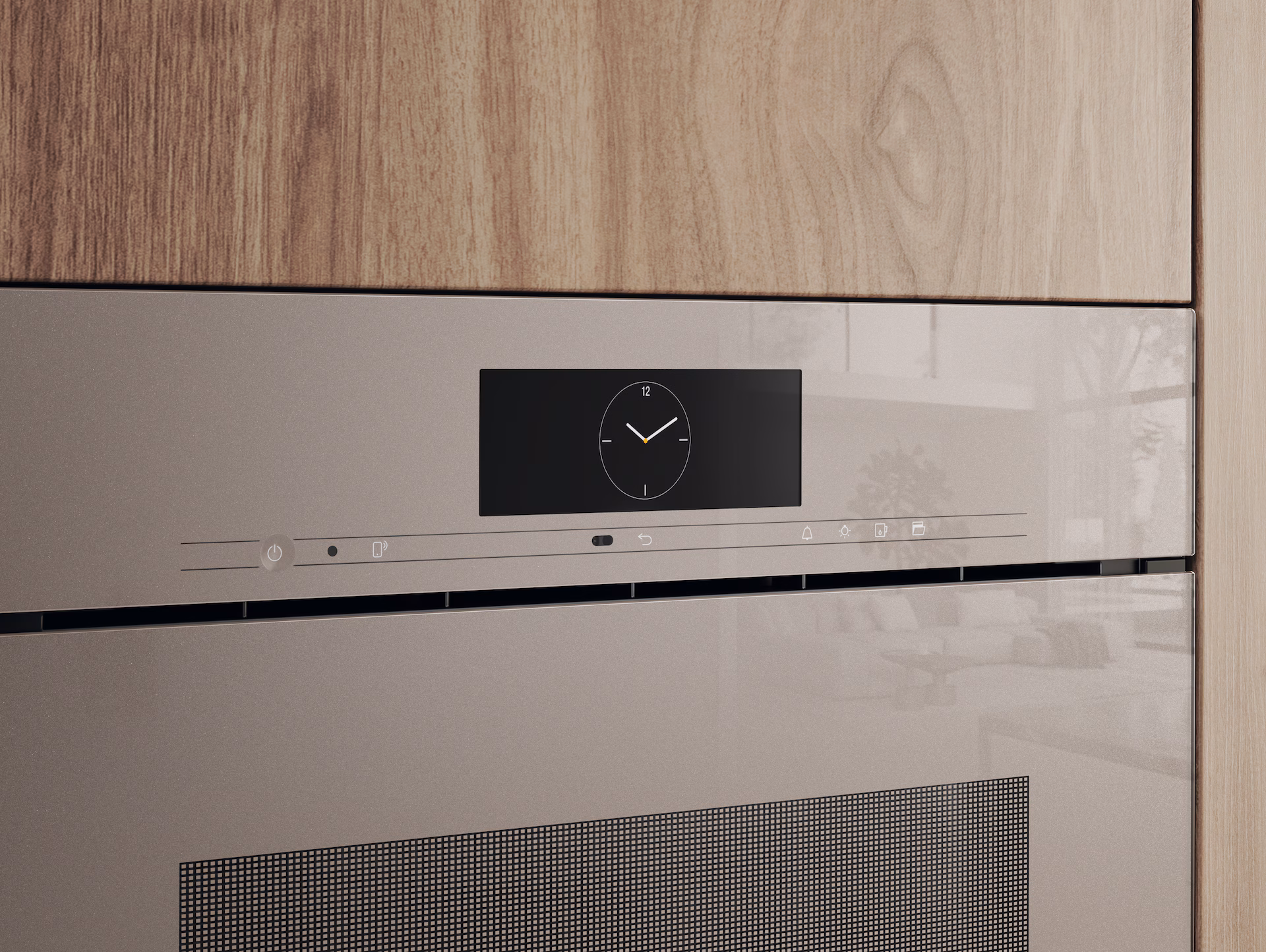 Design and user convenience combined: the control panel opens and closes gently at the touch of a finger – without opening the appliance door. Hidden behind the lift-up control panel are the water container, condensate container and the wireless food probe. The panel tilts towards you when you press the sensor control to give you the best view of the display.