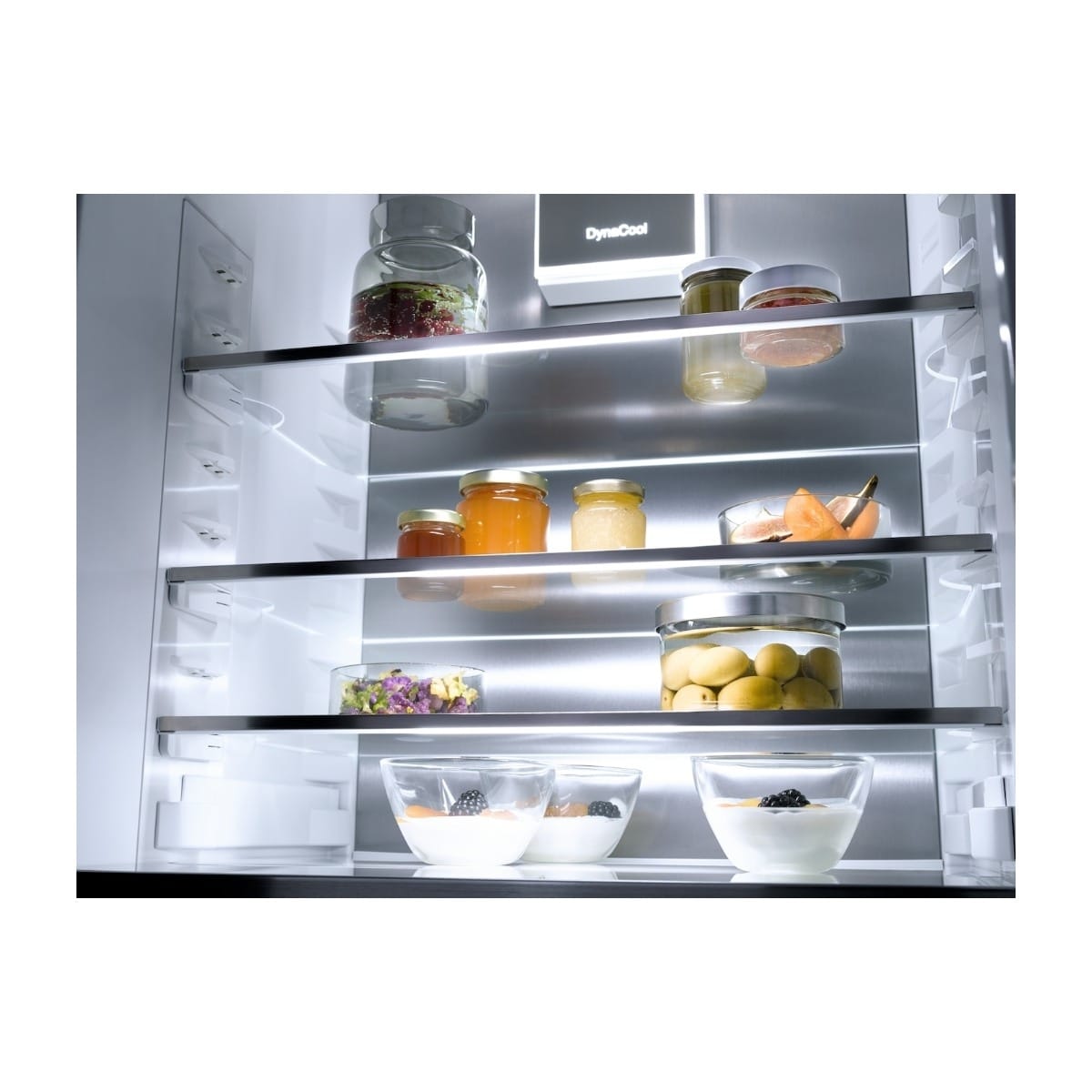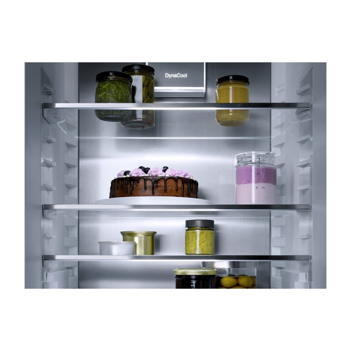 At the heart of the fridge is Miele’s PerfectFresh Active system, which creates ideal conditions for fresh food by actively maintaining the correct humidity. A fine mist of water helps fruit and vegetables stay crisp, flavourful and fresh for significantly longer than conventional refrigeration. This is supported by DynaCool technology, which circulates cool air evenly throughout the cabinet to eliminate temperature fluctuations and ensure consistent cooling across every shelf.