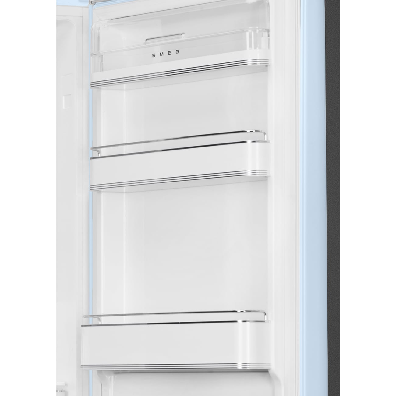 Discover the Smeg FAB32RPB5UK 50’s Style Freestanding RH Fridge Freezer in Pastel Blue on KDH Electrical. Fixed Right Hand Hinged Doors. Frost Free. 2 Adjustable Glass Shelves & 1 Fruit & Veg Drawer. LifePlus 0°C Drawer – Preserve foods for longer.